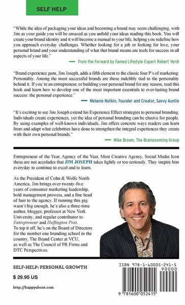 If there is a person who can teach you how to define and create your personal brand, that person is master marketer Jim Joseph. The bestselling author of The Experience Effect has now turned his attention to building that most precious of all brands -- you. In an economy where so many people are struggling, trying to recreate themselves and build new skillsets, the value of a personal brand becomes paramount. As we market ourselves for new careers or take ourselves in new directions, we need to think of ourselves as a brand. What are we projecting? How do those qualities, traits or experiences that we project create a brand that works for us? In other words, how do we create a Personal Experience Effect? Peppered with relevant examples, the book defines what it means to be a brand. The choices we make, their rational and emotional components, the energy we expend towards their projection...all these and more go into creating our personal brands. How do we keep it all conscious and consistent? A personal brand, like any good brand, needs to be consciously managed and controlled. Occasionally, as with corporate brands, a measure of fire-fighting may be required. This book shows us the what, the why and the how. The Personal Experience Effect is not only about big picture strategy. Practical details are discussed too. For example, an entire section is dedicated to creating the perfect elevator pitch. How can a personal brand work not just for today but into the future? Can a personal brand be enhanced over time? What measures of circumspection are required in our digital age, when memories can remain online long after they've been erased in our minds? The author shares this and more, honestly and caringly, narrating personal experiences as well as discussing celebrity brands. With inspiring examples and attention to detail, The Personal Experience Effect shows you how to win support to define, build, and nurture your personal brand. Jim Joseph's eminently readable book helps you Be Who You Want To Be.
