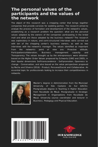 The object of this research was a shopping center that brings together companies that provide services for wedding parties. The research aimed to analyze the process of formation and development of the network's values, establishing as a research problem the question: what are the personal values adopted by the owners of the companies participating in the bridal mall and what are those adopted by the business network? The research was exploratory in nature, and semi-structured interviews were carried out with ten of the shopping center's business owners, as well as two interviews with the network's manager. The values identified as important from the network's point of view are: Proactive attitude, Participation/collaboration, Business management capacity and Transparency. The values brought up by the entrepreneurs were obtained based on the Higher Order Values proposed by Schwartz (1992 and 2005), in their bipolar dimensions Self-transcendence - Self-promotion, Openness to change - Conservation, and also based on the value perspectives proposed by Rocha and Silveira (2016) - Product, Personal/Social and Collaborative. An essential topic for professionals looking to increase their competitiveness in networks.
