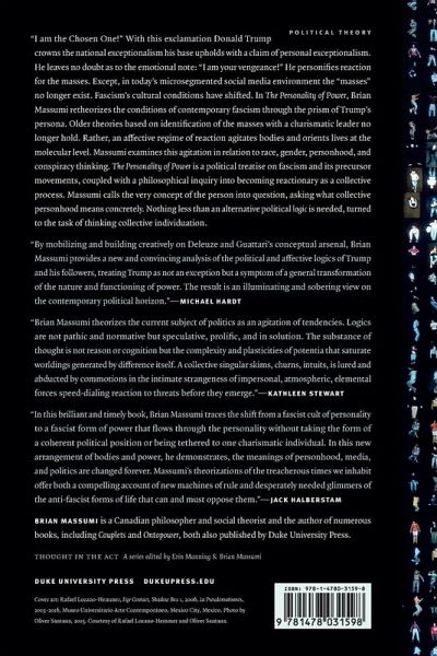 "I am the Chosen One!" With this exclamation Donald Trump crowns the national exceptionalism his base upholds with a claim of personal exceptionalism. He leaves no doubt as to the emotional note: "I am your vengeance!" He personifies reaction for the masses. Except, in today's microsegmented social media environment the "masses" no longer exist. Fascism's cultural conditions have shifted. In The Personality of Power, Brian Massumi retheorizes the conditions of contemporary fascism through the prism of Trump's persona. Older theories based on identification of the masses with a charismatic leader no longer hold. Rather, an affective regime of reaction agitates bodies and orients lives at the molecular level. Massumi examines this agitation in relation to race, gender, personhood, and conspiracy thinking. The Personality of Power is a political treatise on fascism and its precursor movements, coupled with a philosophical inquiry into becoming reactionary as a collective process. Massumi calls the very concept of the person into question, asking what collective personhood means concretely. Nothing less than an alternative political logic is needed, turned to the task of thinking collective individuation.