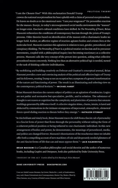 "I am the Chosen One!" With this exclamation Donald Trump crowns the national exceptionalism his base upholds with a claim of personal exceptionalism. He leaves no doubt as to the emotional note: "I am your vengeance!" He personifies reaction for the masses. Except, in today's microsegmented social media environment the "masses" no longer exist. Fascism's cultural conditions have shifted. In The Personality of Power, Brian Massumi retheorizes the conditions of contemporary fascism through the prism of Trump's persona. Older theories based on identification of the masses with a charismatic leader no longer hold. Rather, an affective regime of reaction agitates bodies and orients lives at the molecular level. Massumi examines this agitation in relation to race, gender, personhood, and conspiracy thinking. The Personality of Power is a political treatise on fascism and its precursor movements, coupled with a philosophical inquiry into becoming reactionary as a collective process. Massumi calls the very concept of the person into question, asking what collective personhood means concretely. Nothing less than an alternative political logic is needed, turned to the task of thinking collective individuation.