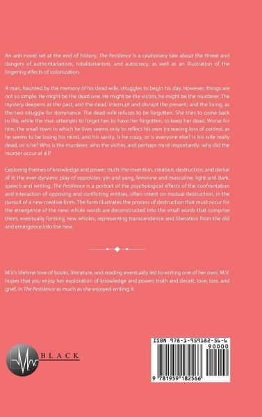 An anti-novel set at the end of history, The Pestilence is a cautionary tale about the threat and dangers of authoritarianism, totalitarianism, and autocracy, as well as an illustration of the lingering effects of colonization: the usurpation and deprivation of autonomy, self-reliance, and self-determination. A man, haunted by the memory of his dead wife, struggles to begin his day. However, things are not so simple. He might be the dead one. He might be the victim, he might be the murderer. The mystery deepens as the past, and the dead, interrupt and disrupt the present, and the living, as the two struggle for dominance. The dead wife refuses to be forgotten. She tries to come back to life, while the man attempts to forget her, to have her forgotten, to keep her dead. Worse for him, the small town in which he lives seems only to reflect his own increasing loss of control, as he seems to be losing his mind, and his sanity. Is he crazy, or is everyone else? Is his wife really dead, or is he? Who is the murderer, who the victim, and perhaps most importantly: why did the murder occur at all? Exploring themes of knowledge and power; truth: the invention, creation, destruction, and denial of it; the ever-dynamic play of opposites: yin and yang, feminine and masculine, light and dark, speech and writing, The Pestilence is a portrait of the psychological effects of the confrontation and interaction of opposing and conflicting entities, often intent on mutual destruction, in the pursuit of a new creative form. The form illustrates the process of destruction that must occur for the emergence of the new: whole words are deconstructed into the small words that comprise them, eventually forming new wholes, representing transcendence and liberation from the old and emergence into the new.