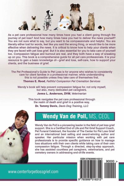 As a pet care professional how many times have you had a client that is going through the journey of pet loss? And how many times have you had to deliver the news yourself? You are not sure what to say, but you want to be compassionate and helpful. You are literally either lost for words, feel like you said the wrong thing, or would like to be more effective when delivering the news. It is critical to know how to help your clients when they are faced with pet loss grief. But it is also essential for you to take care of yourself too. Compassion fatigue and burnout are real, and they both have a way of sneaking up on you. This book is comprehensive guide for all pet care professionals. It is your resource to gain a basic knowledge of-grief and loss, self-care, how to support your clients, and the business of grief.
