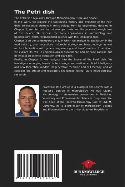 The Petri Dish A Journey Through Microbiological Time and Space:In this work, we explore the fascinating history and evolution of the Petri dish, an essential element in microbiology. From its beginnings, detailed in Chapter 1, we discover the microscopic roots and the journey through time of this device. We discuss the early applications in microbiology and bacteriology, which revolutionized science with this innovative tool.Chapter 2 on the contemporary era, in which we analyze its application in the food industry, pharmaceuticals, microbial ecology and biotechnology, as well as its intersection with genetic engineering and bioinformatics. In addition, we explore its role in epidemiological surveillance and disease control, and its impact on science education and outreach.Finally, in Chapter 3, we navigate into the future of the Petri dish. We investigate emerging trends in technology, automation, artificial intelligence and new theoretical models. Regenerative medicine and cell therapy, and we consider the ethical and regulatory challenges facing future microbiological research.
