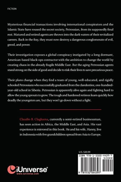 Mysterious financial transactions involving international conspirators and the Islamic State have roused the secret society, Petrossian, from its supposedly final rest. Matured and retired agents are thrown into the dark waters of their revitalized careers. Back in the fray, they must now destroy a dangerous conglomerate of evil, greed, and power. Their investigation exposes a global conspiracy instigated by a long dormant, American-based black-ops contractor with the ambition to change the world by creating chaos in the already fragile Middle East. But the aging Petrossian agents stand strong on the side of good and decide to risk their lives to save precarious peace. Their plans change when they find a team of young, well-educated, and rigidly schooled Petrossians who successfully graduated from the clandestine, one-hundred-year-old school in Siberia. Petrossian is apparently alive again and fighting hard to allow the young sprouts to grow. The tough and hardened retirees learn quickly how deadly the youngsters are, but they wont go down without a fight.
