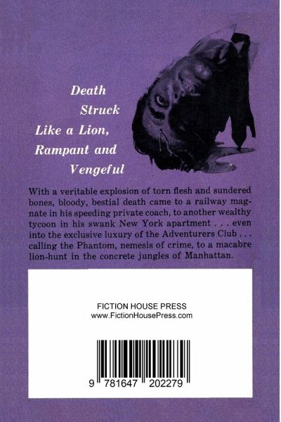With a veritable explosion of torn flesh and sundered bones, bloody, bestial death came to a railway magnate in his speeding private coach, to another wealthy tycoon in his swank New York apartment ... even into the exclusive luxury of the Adventurers Club ... calling the Phantom, nemesis of crime, to a macabre lion-hunt in the concrete jungles of Manhattan.