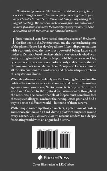 "Ladies and gentlemen," the Lataran president began grimly, eyes scanning the room, "we thank you for making time in your busy schedules to come here. Alarus and I are jointly hosting this urgent meeting. We want to make it clear from the outset that neither of us alone originated the request for your presence. We have a situation which transcends our national interests." Three hundred years have passed since the events of The Search, the first book in the Devistor series, and the western hemisphere of the planet Neptu has developed into fifteen disparate nations with economic ties, the two most powerful being Latara and undersea Zenaja. Out of nowhere, their uneasy peace is jolted by an entity calling itself the Union of Neptu, which launches a shocking cyber-attack on every nation simultaneously and demands that all the governments surrender to them. Zenaja and Latara summon all the other nations to a conference and then head up a search for this mysterious Union. What they discover is absolutely world-changing, but a nationalist political faction in Zenaja seizes control, and rather than uniting against a common enemy, Neptu is soon teetering on the brink of world war. Guided by the mystical Cat, who survives throughout the centuries, the current people of Neptu must somehow face these epic challenges, confront their complicated past, and find a way to devise a different world-lest none of them survive. With unique and compelling characters, a potent mix of fantasy and science fiction, and a hard-driving plot with surprises around every corner, The Phantom Empire returns readers to a deeply fascinating world with an anguished history.