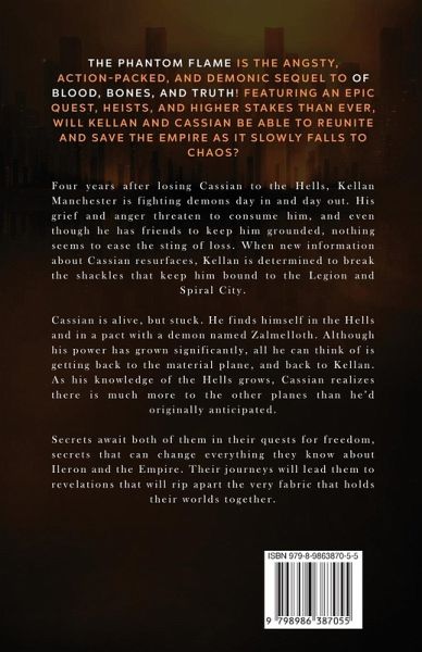 The Phantom Flame is the angsty, action-packed, and demonic sequel to Of Blood, Bones, and Truth! Featuring an epic quest, heists, and higher stakes than ever, will Kellan and Cassian be able to reunite and save the Empire as it slowly falls to chaos? Four years after losing Cassian to the Hells, Kellan Manchester is fighting demons day in and day out. His grief and anger threaten to consume him, and even though he has friends to keep him grounded, nothing seems to ease the sting of loss. When new information about Cassian resurfaces, Kellan is determined to break the shackles that keep him bound to the Legion and Spiral City. Cassian is alive, but stuck. He finds himself in the Hells and in a pact with a demon named Zalmelloth. Although his power has grown significantly, all he can think of is getting back to the material plane, and back to Kellan. As his knowledge of the Hells grows, Cassian realizes there is much more to the other planes than he'd originally anticipated. Secrets await both of them in their quests for freedom, secrets that can change everything they know about Ileron and the Empire. Their journeys will lead them to revelations that will rip apart the very fabric that holds their worlds together.