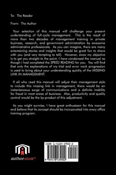 To: The Reader From: The Author Your selection of this manual will challenge your present understanding of full-cycle management. This manual is the result of more than two decades of management training in private business, research, and government administration by awesome administrative professionals. As you can imagine, there are many entertaining stories and insights that would be great fun to share with you (and very tempting to tell). But, since my objective is to get you straight to the point, I have condensed the manual as though I had done the SPEED READING for you. You will find that only the explanations of my trial and error work progression is used to bring about your understanding quickly of the MISSING LINK IN MANAGEMENT. If all who read this manual will adjust their management style to include this missing link in management, there would be an instantaneous surge of communications and a definite inability for fraud in most areas of business. Also, productivity and quality control would be the by-product of this adjustment. As you might surmise, I have great enthusiasm for this manual and believe that its concept should be incorporated into every office training program.