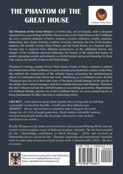 The Phantom of the Great House is a Gothic play, set in Grenada, with a sub-genre categorised as a psychological thriller. Based on the iconic Great House in the Caribbean, the story combines elements of horror, romance, mystery, seduction, murder, suspense, debauchery, lust, obeah, brutality, zombies, love/lust, treachery, the role of the incubus, madness, the morally corrupt white Planter, and the Great House, as a haunted space. Psychic fear is explored from different perspectives: as the subliminal horrors and dangers of the Caribbean physical landscape; the history of the island that haunts its people; operating socially and culturally as a belief system, and as real haunting, by those who witness the horrific events in the Great House. Thompson's writing, whether Novel, Short stories, Poetry or Plays, continue to address the liminal status of the Caribbean in a post-colonial, post-modernist context. In this Play, she explores the complexities of the colonial legacy; presenting the epistemological effects of colonization that inform her work. Identifying as a Caribbean writer, Roselle Thompson uses her art to delve into some of the deep colonial damage on the psyche of the people, their cultural heritages, and their resultant discourse and thinking. Therefore, this play's themes include the colonial burden on succeeding generations, fragmentation of Caribbean identity, and the role of the Caribbean Writer, in a post-colonial epoch; as being instrumental in either directing or redirecting society.