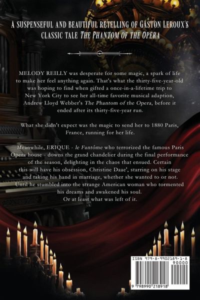 "Accidental time travel, murder, and a dangerous masked man? When I said I needed some magic in my life, this was not what I meant." Blurb: MELODY REILLY was desperate for some magic, a spark of life to make her feel anything again. That's what the thirty-five-year-old was hoping to find when gifted a once-in-a-lifetime trip to New York City to see her all-time favorite musical adaption, Andrew Lloyd Webber's The Phantom of the Opera, before it ended after its thirty-five-year run. What she didn't expect was the magic to send her to 1880 Paris, France, running for her life. Meanwhile, ERIQUE - le Fantôme who terrorized the famous Paris Opera house - downs the grand chandelier during the final performance of the season, delighting in the chaos that ensued. Certain this will have his obsession, Christine Daae', starring on his stage and taking his hand in marriage, whether she wanted to or not. Until he stumbled into the strange American woman who tormented his dreams and awakened his soul. Or at least what was left of it. (recommended 18+ for adult situations, violence and language)
