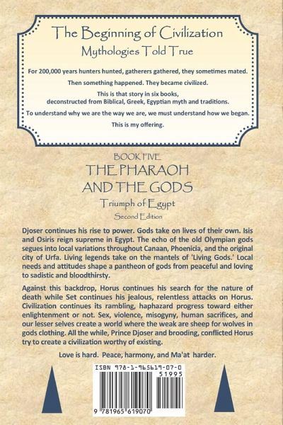 The Pharaoh and the Gods: Triumph of Egypt, Second Edition: Djoser continues his rise to power. Gods take on lives of their own. Isis and Osiris reign supreme in Egypt. The echo of the old Olympian gods segues into local variations throughout Canaan, Phoenicia, and the original city of Urfa. Living legends take on the mantels of 'Living Gods.' Local needs and attitudes shape a pantheon of gods from peaceful and loving to sadistic and bloodthirsty. Against this backdrop, Horus continues his search for the nature of death while Set continues his jealous, relentless attacks on Horus. Civilization continues its rambling, haphazard progress toward either enlightenment or not. Sex, violence, misogyny, human sacrifices, and our lesser selves create a world where the weak are sheep for wolves in gods clothing. All the while, Prince Djoser and brooding, conflicted Horus try to create a civilization worthy of existing. Love is hard. Peace, harmony, and Ma'at harder. This is the fifth in the six book series, The Beginning of Civilization: Mythologies Told True. For 200,000 years hunters hunted, gatherers gathered, they sometimes mated. Then something happened. They became civilized. This is that story in six books deconstructed from Biblical, Greek, Egyptian, Phoenician myth and traditions. To understand why we are the way we are, we must understand how we began. This is my offering. Let those wiser tell it truer.