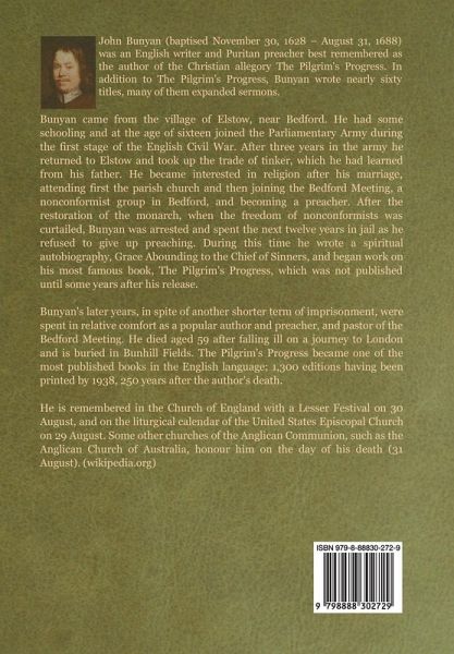 Challenging yet in-depth study of the parable of the Pharisee and the tax collector. Painted a bleak picture of the eternal fate of those who are relying upon any self-righteousness on judgment day. (Chris Pridemore) About John Bunyan: John Bunyan (baptised November 30, 1628 - August 31, 1688) was an English writer and Puritan preacher best remembered as the author of the Christian allegory The Pilgrim's Progress. In addition to The Pilgrim's Progress, Bunyan wrote nearly sixty titles, many of them expanded sermons. Bunyan came from the village of Elstow, near Bedford. He had some schooling and at the age of sixteen joined the Parliamentary Army during the first stage of the English Civil War. After three years in the army he returned to Elstow and took up the trade of tinker, which he had learned from his father. He became interested in religion after his marriage, attending first the parish church and then joining the Bedford Meeting, a nonconformist group in Bedford, and becoming a preacher. After the restoration of the monarch, when the freedom of nonconformists was curtailed, Bunyan was arrested and spent the next twelve years in jail as he refused to give up preaching. During this time he wrote a spiritual autobiography, Grace Abounding to the Chief of Sinners, and began work on his most famous book, The Pilgrim's Progress, which was not published until some years after his release. Bunyan's later years, in spite of another shorter term of imprisonment, were spent in relative comfort as a popular author and preacher, and pastor of the Bedford Meeting. He died aged 59 after falling ill on a journey to London and is buried in Bunhill Fields. The Pilgrim's Progress became one of the most published books in the English language; 1,300 editions having been printed by 1938, 250 years after the author's death. He is remembered in the Church of England with a Lesser Festival on 30 August, and on the liturgical calendar of the United States Episcopal Church on 29 August. Some other churches of the Anglican Communion, such as the Anglican Church of Australia, honour him on the day of his death (31 August). (wikipedia.org)