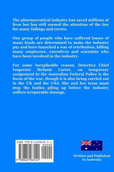 The Pharmacy industry has saved millions of lives throughout the world, but has caused many problems for itself by crimes including false advertising, failures in manufacturing and unethical marketing. For these, many of the manufacturers have faced major charges, trial and massive penalties, sometimes in the billions of dollars. But this is not enough for some people who have suffered severe difficulties because of the behaviour of the organisations. Some have died from wrongly made drugs, some have suffered sickness or physical damage, others have lost their livelihoods. A war of revenge is started by an unknown group and for unknown reasons, it is focused on Detective Chief Inspector Melanie Carter in Australia. Murders occur in the UK, in the USA and Australia, killings of people involved in the pharmaceutical industry in various ways. Melanie and her team must solve this case and end the war before the bodies pile up any further.