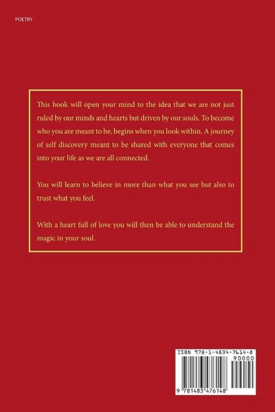 This book will open your mind to the idea that we are not just ruled by our minds and hearts but driven by our souls. To become who you are meant to be, begins when you look within. A journey of self discovery meant to be shared with everyone that comes into your life as we are all connected. You will learn to believe in more than what you see but also to trust what you feel. With a heart full of love you will then be able to understand the magic in your soul.