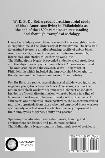 W. E. B. Du Bois's groundbreaking social study of black Americans living in Philadelphia at the end of the 1800s remains an outstanding and thorough example of sociology. Using knowledge gained from research of black neighborhoods during his time at the University of Pennsylvania, Du Bois was determined to create an all-embracing profile of urban black American society. Some three years of intensive research, interviews, and statistical gathering went into The Philadelphia Negro; it revealed endemic social prejudices and the abject poverty which many black Americans endured. The area studied was the Seventh Ward - a borough of Philadelphia which included the impoverished black ghetto, the striving middle-classes, and even affluent whites. For Du Bois, the root causes of the social divide were ingrained negative perceptions towards black Americans, such as the notion that black workers are innately dishonest or indolent. Incidents of racial discrimination, whereby blacks in a line of business or seeking employ are turned aside on the basis of skin color, are numerous. More positively, the author unearthed multiple appraisals from those who had employed black workers - some only as a last resort - who became very impressed at their employee's diligence, ability and passion. Spanning the education, recreation, work, housing and environment conditions, and much more besides, The Philadelphia Negro remains a landmark text of sociology.
