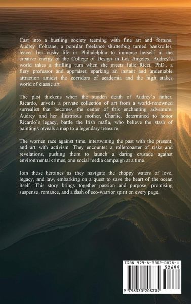 Cast into a bustling society teeming with fine art and fortune, Audrey Coltrane, a popular freelance shutterbug turned bankroller, leaves her cushy life in Philadelphia to immerse herself in the creative energy of the College of Design in Los Angeles. Audrey's world takes a thrilling turn when she meets Julie Ricci, PhD., a fiery professor and appraiser, sparking an instant and undeniable attraction amidst the corridors of academia and the high stakes world of classic art. The plot thickens when the sudden death of Audrey's father, Ricardo, unveils a private collection of art from a world-renowned surrealist that becomes the center of this enchanting adventure. Audrey and her illustrious mother, Charlie, determined to honor Ricardo's legacy, battle the Irish mafia, who believe the stash of paintings reveals a map to a legendary treasure. The women race against time, intertwining the past with the present, and art with activism. They encounter a rollercoaster of risks and revelations, pushing them to launch a daring crusade against environmental crimes, one social media campaign at a time. Join these heroines as they navigate the choppy waters of love, legacy, and law, embarking on a quest to save the heart of the ocean itself. This story brings together passion and purpose, promising suspense, romance, and a dash of eco-warrior spirit on every page.
