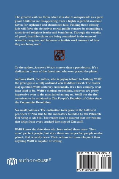 The greatest evil can thrive when it is able to masquerade as a great good. Children are disappearing from a highly regarded academic haven for orphaned and abandoned kids. Finding these missing kids will force the detectives to risk public censure by unmasking a much-loved religious leader and benefactor. Through the venality of greed, horrible crimes are being committed in the name of scientific progress; and innocent scientists work unaware of how they are being used.