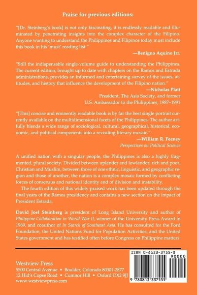 A unified nation with a single people, the Philippines is also a highly fragmented, plural society. Divided between uplander and lowlander, rich and poor, Christian and Muslim, between those of one ethnic, linguistic, and geographic region and those of another, the nation is a complex mosaic formed by conflicting forces of consensus and national identity and of division and instability.It is not possible to comprehend the many changes in the Philippines?such as the rise and fall of Ferdinand Marcos or the revolution that toppled him?without an awareness of the religious, cultural, and economic forces that have shaped the history of these islands. These forces formed the focus of the first edition of The Philippines. Of that 1982 edition, the late Benigno Aquino Jr., noted that ?anyone wanting to understand the Philippines and the Filipinos today must include this book in his '`'must' reading list.?The fourth edition has been updated through the final years of the Ramos presidency, and contains a new section on the impact of President Estrada.