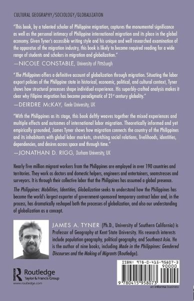 Nearly five million migrant workers from the Philippines are employed in over 190 countries and territories. They work as doctors and domestic helpers, engineers and entertainers, seamstresses and surveyors. It is through their collective labor that the Philippines has assumed a global presence. For over five centuries the Philippines has been integrated into the world economy. Only recently, however, has the Philippines been a pro-active agent in the production of a global economy. Since the 1970s the Philippine state, in connection with myriad private institutions, has recruited, trained, marketed, and deployed a mobile work-force. Annually, approximately one million migrant workers travel to all corners of the world. The Philippines seeks to understand how the Philippines has become the world's largest exporter of government-sponsored temporary contract labor and, in the process, has dramatically reshaped both the processes of globalization and also our understanding of globalization as concept.