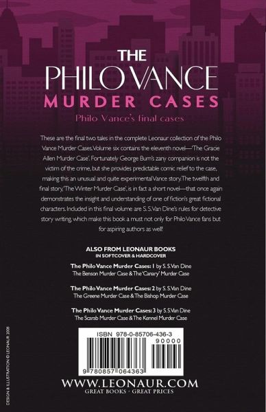 Philo Vance's final cases These are the final two tales in the complete Leonaur collection of the Philo Vance Murder Cases. Volume six contains the eleventh novel-'The Gracie Allen Murder Case'. Fortunately George Burn's zany companion is not the victim of the crime, but she provides predictable comic relief to the case, making this an unusual and quite experimental Vance story. The twelfth and final story, 'The Winter Murder Case', is in fact a short novel-that once again demonstrates the insight and understanding of one of fiction's great fictional characters. Included in this final volume are S. S. Van Dine's rules for detective story writing, which make this book a must not only for Philo Vance fans but for aspiring authors as well!