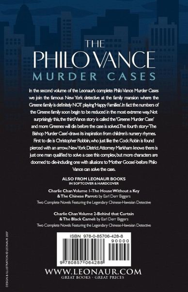 In the second volume of the Leonaur's complete Philo Vance Murder Cases we join the famous New York detective at the family mansion where the Greene family is definitely not playing 'Happy Families'. In fact the numbers of the Greene family soon begin to be reduced in the most extreme way. Not surprisingly this, the third Vance story is called the 'Greene Murder Case' and more Greenes will die before the case is solved. The fourth story-'The Bishop Murder Case'-draws its inspiration from children's nursery rhymes. First to die is Christopher Robbin, who just like the Cock Robin is found pierced with an arrow. New York District Attorney Markham knows there is just one man qualified to solve a case this complex, but more characters are doomed to die-including one with allusions to 'Mother Goose'-before Philo Vance can solve the case.