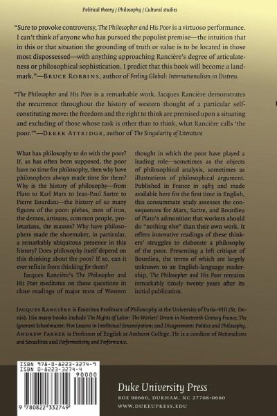 Ranciere's account of Western philosophical thought from Plato to Bourdieu argues that philosophers depend on an ideal "poor" for their own analyses but preclude them from abstract thought