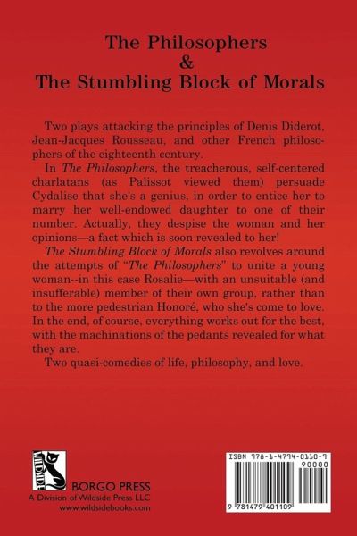 Two plays attacking the principles of Denis Diderot, Jean-Jacques Rousseau, and other French philosophers of the eighteenth century. In THE PHILOSOPHERS, the treacherous, self-centered charlatans (as Palissot viewed them) persuade Cydalise that she's a genius, in order to entice her to marry her well-endowed daughter to one of their number. Actually, they despise the woman and her opinions--a fact which is soon revealed to her! THE STUMBLING BLOCK OF MORALS also revolves around the attempts of "The Philosophers" to unite a young woman--in this case Rosalie--with an unsuitable (and insufferable) member of their own group, rather than to the more pedestrian Honoré, who she's come to love. In the end, of course, everything works out for the best, with the machinations of the pedants revealed for what they are. Two quasi-comedies of life, philosophy, and love.