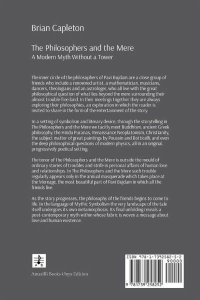The inner circle of the philosophers of Pavi Bujdam are a close group of friends who include a renowned artist, a mathematician, musicians, dancers, theologians and an astrologer, who all live with the great philosophical question of what lies beyond the mere surrounding their almost trouble-free land. In their meetings together they are always exploring their philosophies, an exploration in which the reader is invited to share in the form of the entertainment of the story. In a setting of symbolism and literary device, through the storytelling in The Philosophers and the Mere we tacitly meet Buddhism, ancient Greek philosophy, the Hindu Puranas, Renaissance Neoplatonism, Christianity, the subject matter of great paintings by Poussin and Botticelli, and even the deep philosophical questions of modern physics, all in an original, progressively poetical setting. The tenor of The Philosophers and the Mere is outside the mould of ordinary stories of troubles and strife in personal affairs of human love and relationships. In The Philosophers and the Mere such trouble regularly appears only in the annual masquerade which takes place at the Mereage, the most beautiful part of Pavi Bujdam in which all the friends live. As the story progresses, the philosophy of the friends begins to come to life. In the language of Mythic Symbolism the very landscape of the tale itself undergoes its own metamorphosis. Its final unfolding reveals a post-contemporary myth within whose fabric is woven a message about love and human existence.
