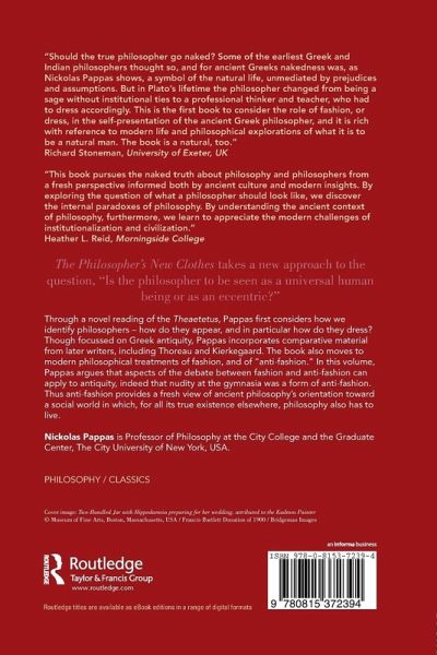 This book discusses modern philosophical treatments of fashion, and of "anti-fashion". Pappas argues that the fashion/anti-fashion debate applies to antiquity, that nudity at the gymnasia was an anti-fashion. Thus anti-fashion provides a way of viewing ancient philosophy's orientation toward a social world in which philosophy also has to live.