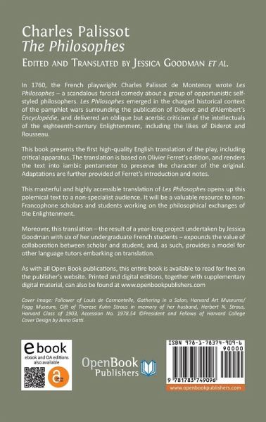 In 1760, the French playwright Charles Palissot de Montenoy wrote Les Philosophes - a scandalous farcical comedy about a group of opportunistic self-styled philosophers. Les Philosophes emerged in the charged historical context of the pamphlet wars surrounding the publication of Diderot and d'Alembert's Encyclopédie, and delivered an oblique but acerbic criticism of the intellectuals of the eighteenth-century Enlightenment, including the likes of Diderot and Rousseau. This book presents the first high-quality English translation of the play, including critical apparatus. The translation is based on Olivier Ferret's edition, and renders the text into iambic pentameter to preserve the character of the original. Adaptations are further provided of Ferret's introduction and notes. This masterful and highly accessible translation of Les Philosophes opens up this polemical text to a non-specialist audience. It will be a valuable resource to non-Francophone scholars and students working on the philosophical exchanges of the Enlightenment. Moreover, this translation - the result of a year-long project undertaken by Jessica Goodman with six of her undergraduate French students - expounds the value of collaboration between scholar and student, and, as such, provides a model for other language tutors embarking on translation projects with their students.
