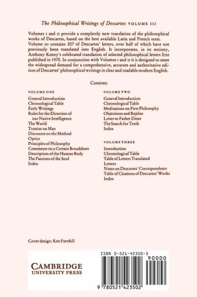 Volumes I and II provide a completely new translation of Descartes' philosophical works, based on the best available Latin and French texts. This volume contains 207 of Descartes' letters, over half of which have not been translated into English before, including Anthony Kenny's translation of selected philosophical letters, first published in 1970.