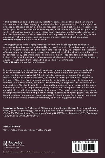 Emerging research on the subject of happiness-in psychology, economics, and public policy-reawakens and breathes new life into long-standing philosophical questions about happiness (e.g., What is it? Can it really be measured or pursued? What is its relationship to morality?). By analyzing this research from a philosophical perspective, Lorraine L. Besser is able to weave together the contributions of other disciplines, and the result is a robust, deeply contoured understanding of happiness made accessible for nonspecialists. This book is the first to thoroughly investigate the fundamental theoretical issues at play in all the major contemporary debates about happiness, and it stands out especially in its critical analysis of empirical research. The book's coverage of the material is comprehensive without being overwhelming. Its structure and pedagogical features will benefit students or anyone studying happiness for the first time: Each chapter opens with an initial overviewand ends with a summary and list of suggested readings.