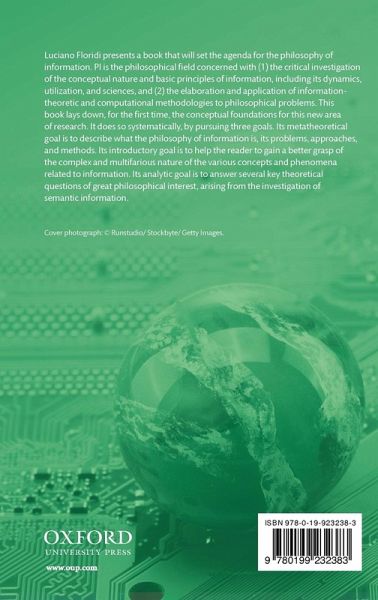 Luciano Floridi presents a book that will set the agenda for the philosophy of information. PI is the philosophical field concerned with (1) the critical investigation of the conceptual nature and basic principles of information, including its dynamics, utilisation, and sciences, and (2) the elaboration and application of information-theoretic and computational methodologies to philosophical problems. This book lays down, for the first time, the conceptual foundations for this new area of research. It does so systematically, by pursuing three goals. Its metatheoretical goal is to describe what the philosophy of information is, its problems, approaches, and methods. Its introductory goal is to help the reader to gain a better grasp of the complex and multifarious nature of the various concepts and phenomena related to information. Its analytic goal is to answer several key theoretical questions of great philosophical interest, arising from the investigation of semantic information.