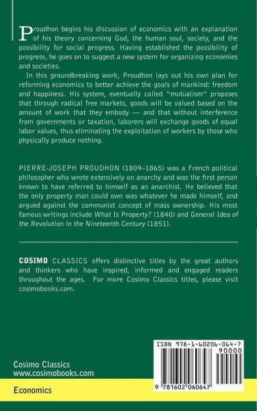 Proudhon begins his discussion of economics with an explanation of his theory concerning God, the human soul, society, and the possibility for social progress. Having established the possibility of progress, he goes on to suggest a new system for organizing economies and societies. In this groundbreaking work, Proudhon lays out his own plan for reforming economics to better achieve the goals of mankind: freedom and happiness. His system, eventually called "mutualism" proposes that through radical free markets, goods will be valued based on the amount of work that they embody - and that without interference from governments or taxation, laborers will exchange goods of equal labor values, thus eliminating the exploitation of workers by those who physically produce nothing. PIERRE-JOSEPH PROUDHON (1809-1865) was a French political philosopher who wrote extensively on anarchy and was the first person known to have referred to himself as an anarchist. He believed that the only property man could own was whatever he made himself, and argued against the communist concept of mass ownership. His most famous writings include What Is Property? (1840) and General Idea of the Revolution in the Nineteenth Century (1851).