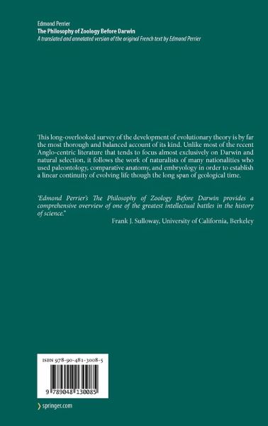 "The Philosophy of Zoology Before Darwin. A Translated and Annotated Version of the Original French Text by Emond Perrier is a welcome and much-needed addition to a huge volume of literature in the history of biology. As McBirney notes in his introduction to this translation, he was surprised to find Perrier's history so ignored within the canon of history of biology. Perrier's history provides a unique synthesis of pre-Darwinian philosophical assumptions-he traces these premises throughout the centuries and millennia of their influence in his short, informative, biographical sketches. The book is a solid reminder of a time in the history of biology when history itself carried legitimate explanatory power." Review by Lydia Pyne, PaleoAnthropology 2010