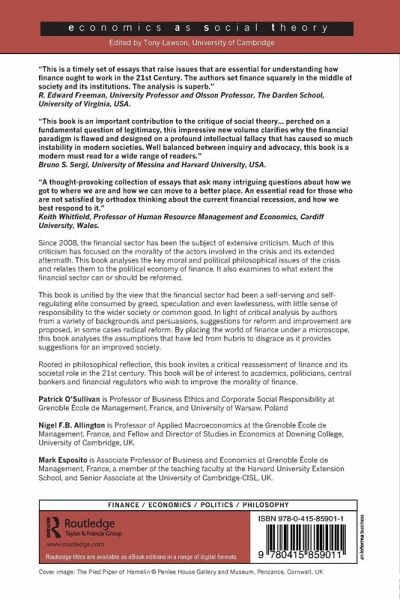 Rooted in philosophical reflection, this book invites a critical reassessment of finance and its societal role in the 21st century. This book will be of interest to academics, politicians, central bankers and financial regulators who wish to improve the morality of finance.