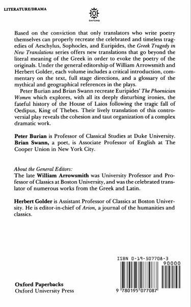 Peter Burian and Brian Swann re-create Euripides' The Phoenician Women, a controversial play about the fateful history of the house of Laios following the tragic fall of Oedipus, King of Thebes. Adding to the impressive Greek Tragedy in New Translations series, this translation displays the cohesion and rigid organization of this complex and much debated play. Through use of dramatic, fast-paced poetry, this version captures the original spirit of Euripides' focus on classic repercussions of fate, interspersed with the everpresent power of will. The edition is accompanied by critical introductions, expositions of translators' principles, stage directions, a glossary of mythical Greek terms, and commentary on difficult passages.