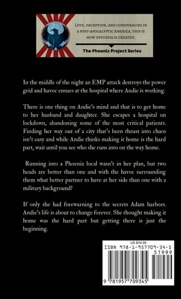 In the middle of the night an EMP attack destroys the power grid and havoc ensues at the hospital where Andie is working. There is one thing on Andie's mind and that is to get home to her husband and daughter. She escapes a hospital on lockdown, abandoning some of the most critical patients. Finding her way out of a city that's been thrust into chaos isn't easy and while Andie thinks making it home is the hard part, wait until you see who she runs into on the way home. Running into a Phoenix local wasn't in her plan, but two heads are better than one and with the havoc surrounding them what better partner to have at her side than one with a military background? If only she had forewarning to the secrets Adam harbors. Andie's life is about to change forever. She thought making it home was the hard part but getting there is just the beginning.