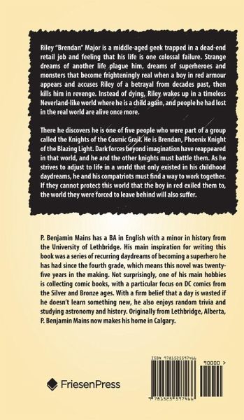 Riley "Brendan" Major is a middle-aged geek trapped in a dead-end retail job and feeling that his life is one colossal failure. Strange dreams of another life plague him, dreams of superheroes and monsters that become frighteningly real when a boy in red armour appears and accuses Riley of a betrayal from decades past, then kills him in revenge. Instead of dying, Riley wakes up in a timeless Neverland-like world where he is a child again, and people he had lost in the real world are alive once more. There he discovers he is one of five people who were part of a group called the Knights of the Cosmic Grail. He is Brendan, Phoenix Knight of the Blazing Light. Dark forces beyond imagination have reappeared in that world, and he and the other knights must battle them. As he strives to adjust to life in a world that only existed in his childhood daydreams, he and his compatriots must find a way to work together. If they cannot protect this world that the boy in red exiled them to, the world they were forced to leave behind will also suffer.
