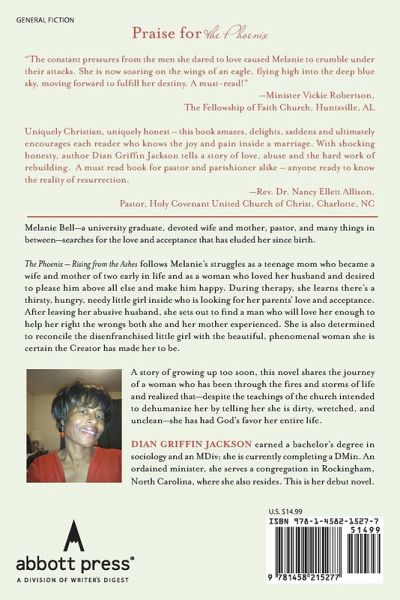 Praise for The Phoenix "The constant pressures from the men she dared to love caused Melanie to crumble under their attacks. She is now soaring on the wings of an eagle, flying high into the deep blue sky, moving forward to fulfill her destiny. A must-read!" -Minister Vickie Robertson, The Fellowship of Faith Church, Huntsville, AL Uniquely Christian, uniquely honest - this book amazes, delights, saddens and ultimately encourages each reader who knows the joy and pain inside a marriage. With shocking honesty, author Dian Griffin Jackson tells a story of love, abuse and the hard work of rebuilding. A must read book for pastor and parishioner alike - anyone ready to know the reality of resurrection. -Rev. Dr. Nancy Ellett Allison, Pastor, Holy Covenant United Church of Christ, Charlotte, NC Melanie Bell-a university graduate, devoted wife and mother, pastor, and many things in between-searches for the love and acceptance that has eluded her since birth. The Phoenix - Rising from the Ashes follows Melanie's struggles as a teenage mom who became a wife and mother of two early in life and as a woman who loved her husband and desired to please him above all else and make him happy. During therapy, she learns there's a thirsty, hungry, needy little girl inside who is looking for her parents' love and acceptance. After leaving her abusive husband, she sets out to find a man who will love her enough to help her right the wrongs both she and her mother experienced. She is also determined to reconcile the disenfranchised little girl with the beautiful, phenomenal woman she is certain the Creator has made her to be. A story of growing up too soon, this novel shares the journey of a woman who has been through the fires and storms of life and realized that-despite the teachings of the church intended to dehumanize her by telling her she is dirty, wretched, and unclean-she has had God's favor her entire life.