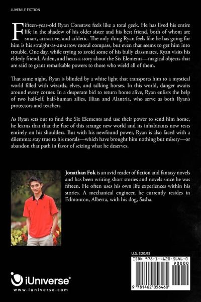 Fifteen-year-old Ryan Constave feels like a total geek. He has lived his entire life in the shadow of his older sister and his best friend, both of whom are smart, attractive, and athletic. The only thing Ryan feels like he has going for him is his straight-as-an-arrow moral compass, but even that seems to get him into trouble. One day, while trying to avoid some of his bully classmates, Ryan visits his elderly friend, Aiden, and hears a story about the Six Elements-magical objects that are said to grant remarkable powers to those who wield all of them. That same night, Ryan is blinded by a white light that transports him to a mystical world filled with wizards, elves, and talking horses. In this world, danger awaits around every corner. In a desperate bid to return home alive, Ryan enlists the help of two half-elf, half-human allies, Illian and Alantria, who serve as both Ryan's protectors and teachers. As Ryan sets out to find the Six Elements and use their power to send him home, he learns that that the fate of this strange new world and its inhabitants now rests entirely on his shoulders. But with his newfound power, Ryan is also faced with a dilemma: stay true to his morals-which have brought him nothing but misery-or abandon that path in favor of seizing what he deserves.