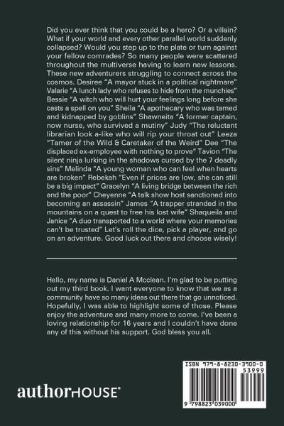 Did you ever think that you could be a hero? Or a villain? What if your world and every other parallel world suddenly collapsed? Would you step up to the plate or turn against your fellow comrades? So many people were scattered throughout the multiverse having to learn new lessons. These new adventurers struggling to connect across the cosmos. Desiree "A mayor stuck in a political nightmare" Valarie "A lunch lady who refuses to hide from the munchies" Bessie "A witch who will hurt your feelings long before she casts a spell on you" Sheila "A apothecary who was tamed and kidnapped by goblins" Shawneita "A former captain, now nurse, who survived a mutiny" Judy "The reluctant librarian look a-like who will rip your throat out" Leeza "Tamer of the Wild & Caretaker of the Weird" Dee "The displaced ex-employee with nothing to prove" Tavion "The silent ninja lurking in the shadows cursed by the 7 deadly sins" Melinda "A young woman who can feel when hearts are broken" Rebekah "Even if prices are low, she can still be a big impact" Gracelyn "A living bridge between the rich and the poor" Cheyenne "A talk show host sanctioned into becoming an assassin" James "A trapper stranded in the mountains on a quest to free his lost wife" Shaqueila and Janice "A duo transported to a world where your memories can't be trusted" Let's roll the dice, pick a player, and go on an adventure. Good luck out there and choose wisely!