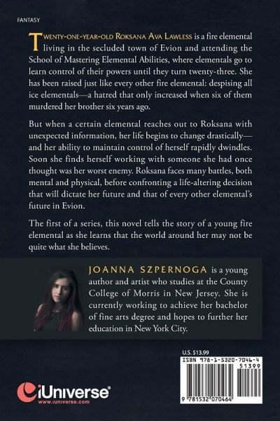 Twenty-one-year-old Roksana Ava Lawless is a fire elemental living in the secluded town of Evion and attending the School of Mastering Elemental Abilities, where elementals go to learn control of their powers until they turn twenty-three. She has been raised just like every other fire elemental: despising all ice elementals-a hatred that only increased when six of them murdered her brother six years ago. But when a certain elemental reaches out to Roksana with unexpected information, her life begins to change drastically-and her ability to maintain control of herself rapidly dwindles. Soon she finds herself working with someone she had once thought was her worst enemy. Roksana faces many battles, both mental and physical, before confronting a life-altering decision that will dictate her future and that of every other elemental's future in Evion. The first of a series, this novel tells the story of a young fire elemental as she learns that the world around her may not be quite what she believes.