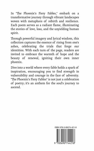 In "The Phoenix's Fiery Fables," embark on a transformative journey through vibrant landscapes woven with metaphors of rebirth and resilience. Each poem serves as a radiant flame, illuminating the stories of love, loss, and the unyielding human spirit. Through powerful imagery and lyrical wisdom, this collection captures the essence of rising from one's ashes, celebrating the trials that forge our identities. With each turn of the page, readers are invited to embrace the warmth of hope and the beauty of renewal, igniting their own inner phoenix. Dive into a world where every fable holds a spark of inspiration, encouraging you to find strength in vulnerability and courage in the face of adversity. "The Phoenix's Fiery Fables" is not just a celebration of poetry; it's an anthem for the soul's journey to ascend.