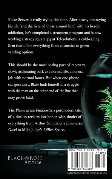 Blake Seever is really trying this time. After nearly destroying his life (and the lives of those around him) with his heroin addiction, he's completed a treatment program and is now working a steady square gig at Telesolutions, a cold-calling firm that offers everything from cosmetics to green vending options. This should be the most boring part of recovery, slowly acclimating back to a normal life, a normal job with normal hours. But when one phone call goes awry, Blake finds himself in a struggle with the man on the other end of the line that may prove fatal. The Phone in the Fishbowl is a postmodern tale of a duel to reclaim lost honor, with shades of everything from Arthur Schnitzler's Lieutenant Gustl to Mike Judge's Office Space.