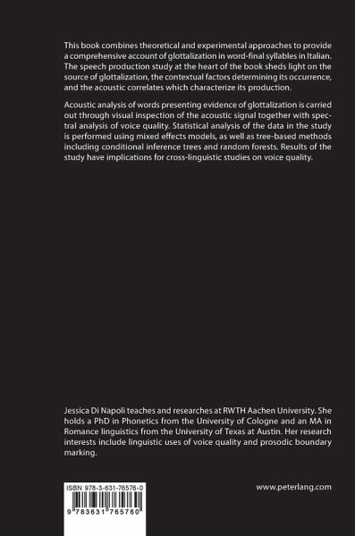 This book combines theoretical and experimental approaches to provide a comprehensive account of glottalization in word-final syllables in Italian. The speech production study at the heart of the book sheds light on the source of glottalization, the contextual factors determining its occurrence, and the acoustic correlates which characterize its production.