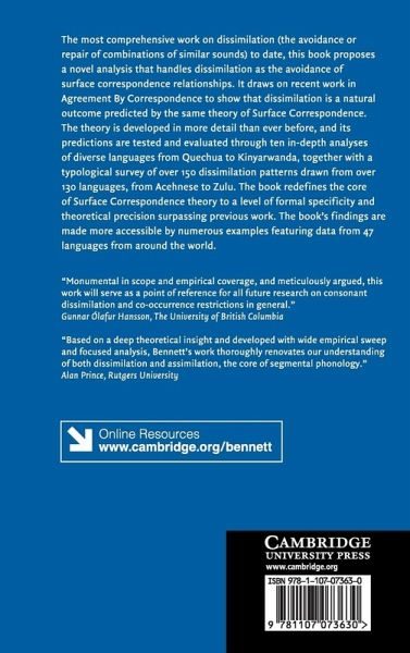 The most comprehensive work on dissimilation (the avoidance or repair of combinations of similar sounds) to date, this book proposes a novel analysis that handles dissimilation as the avoidance of surface correspondence relationships. It draws on recent work in Agreement By Correspondence to show that dissimilation is a natural outcome predicted by the same theory of Surface Correspondence. The theory is developed in more detail than ever before, and its predictions are tested and evaluated through ten in-depth analyses of diverse languages from Quechua to Kinyarwanda, together with a typological survey of over 150 dissimilation patterns drawn from over 130 languages, from Acehnese to Zulu. The book redefines the core of Surface Correspondence theory to a level of formal specificity and theoretical precision surpassing previous work. The book's findings are made more accessible by numerous examples featuring data from 47 languages from around the world.