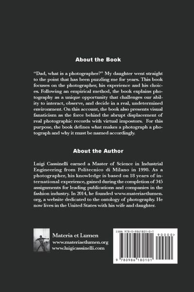 "Dad, what is a photographer?" My daughter went straight to the point that has been puzzling me for years. This book focuses on the photographer, his experience and his choices. Following an empirical method, the book explains photography as a unique opportunity that challenges our ability to interact, observe, and decide in a real, undetermined environment. On this account, the book also presents visual fanaticism as the force behind the abrupt displacement of real photographic records with virtual impostors. For this purpose, the book defines what makes a photograph a photograph and why it must be named accordingly.