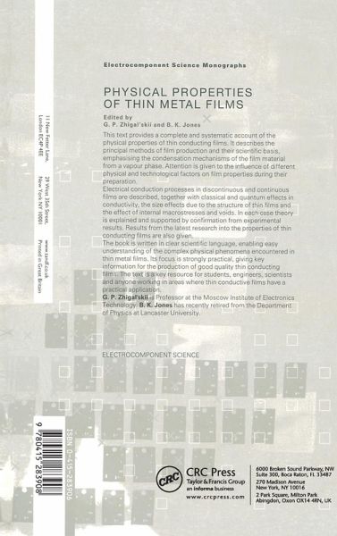 Thin films of conducting materials, such as metals, alloys and semiconductors are currently in use in many areas of science and technology, particularly in modern integrated circuit microelectronics that require high quality thin films for the manufacture of connection layers, resistors and ohmic contacts. These conducting films are also important for fundamental investigations in physics, radio-physics and physical chemistry. Physical Properties of Thin Metal Films provides a clear presentation of the complex physical properties particular to thin conducting films and includes the necessary theory, confirming experiments and applications. The volume will be an invaluable reference for graduates, engineers and scientists working in the electronics industry and fields of pure and applied science.