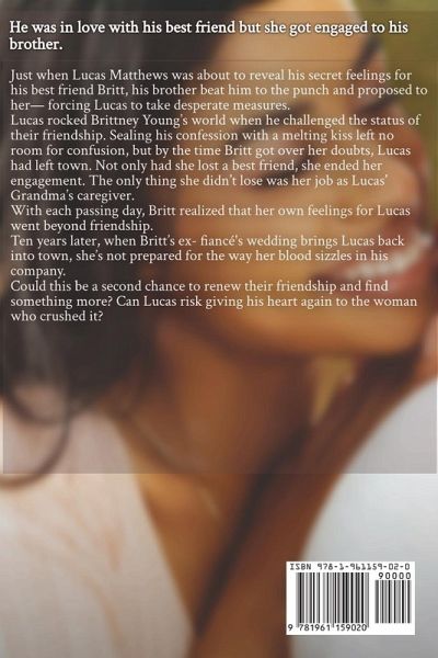 He was in love with his best friend but she got engaged to his brother. Just when Lucas Matthews was about to reveal his secret feelings for his best friend Britt, his brother beat him to the punch and proposed to her- forcing Lucas to take desperate measures. Lucas rocked Brittney Young's world when he challenged the status of their friendship. Sealing his confession with a melting kiss left no room for confusion, but by the time Britt got over her doubts, Lucas had left town. Not only had she lost a best friend, she ended her engagement. The only thing she didn't lose was her job as Lucas' Grandma's caregiver. With each passing day, Britt realized that her own feelings for Lucas went beyond friendship. Ten years later, when Britt's ex- fiancé's wedding brings Lucas back into town, she's not prepared for the way her blood sizzles in his company. Could this be a second chance to renew their friendship and find something more? Can Lucas risk giving his heart again to the woman who crushed it?